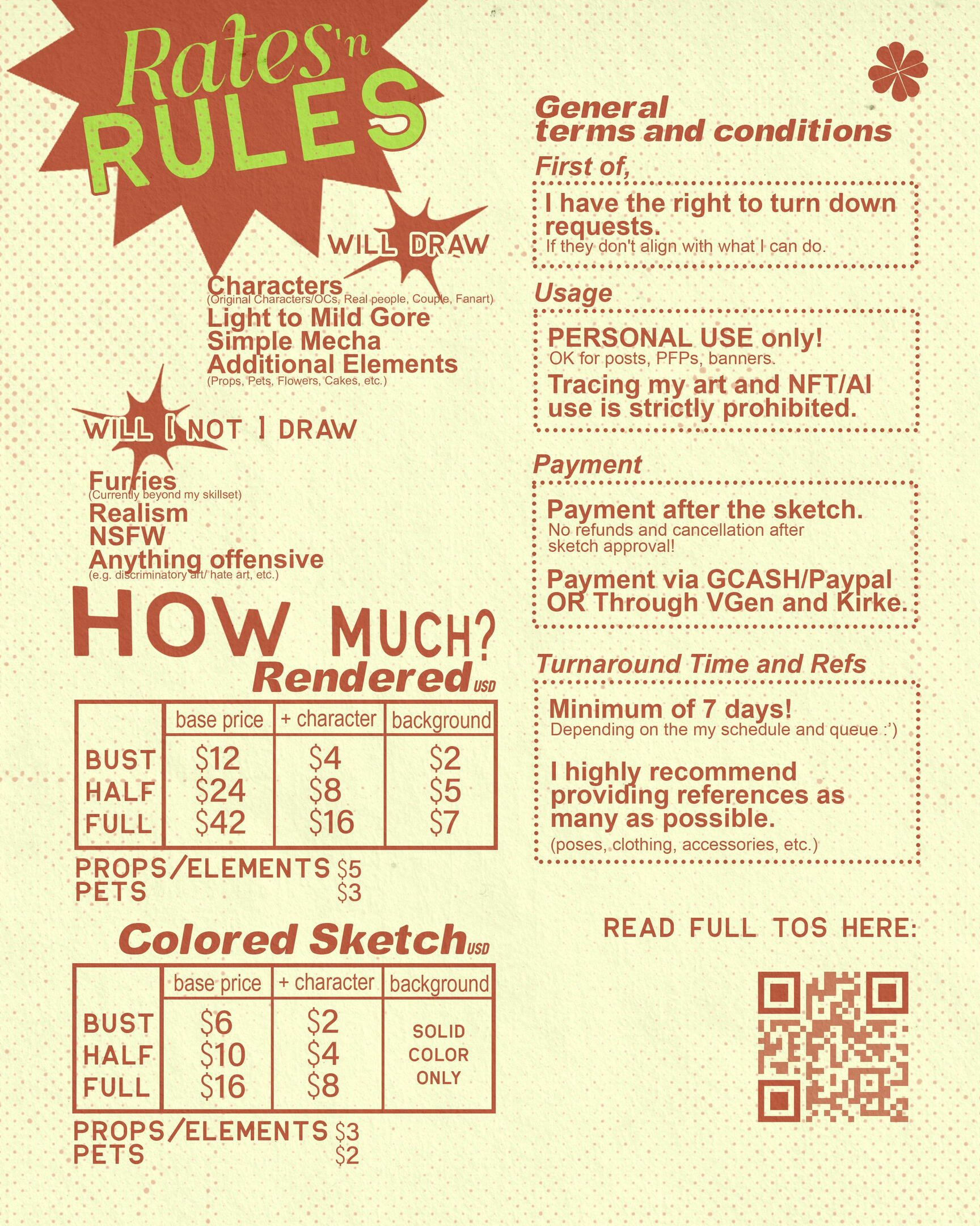 ❁ Will not be taking rush orders for now (sorry!).╰┈➤ ❝ [ If there are any delays, I'll make sure to keep you updated! I draw using a potato device, so please be patient with me. ] ❞